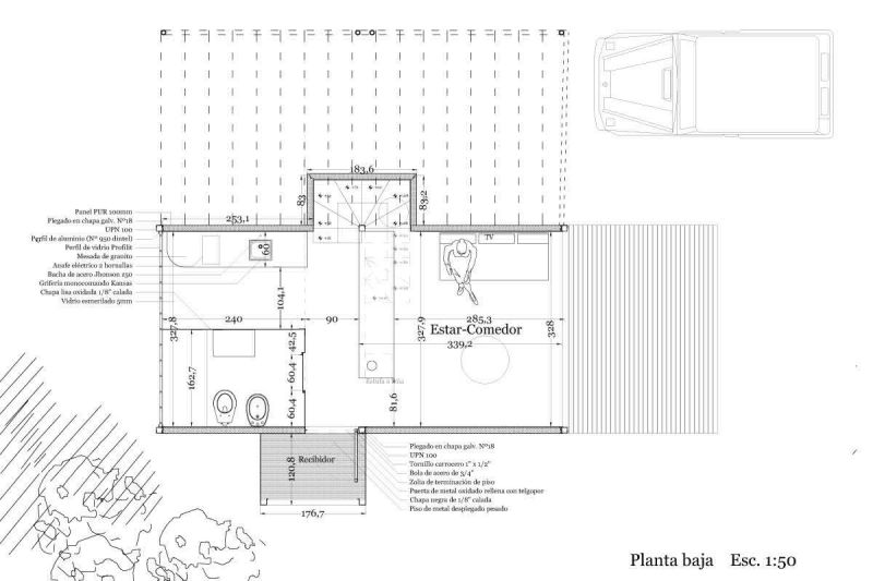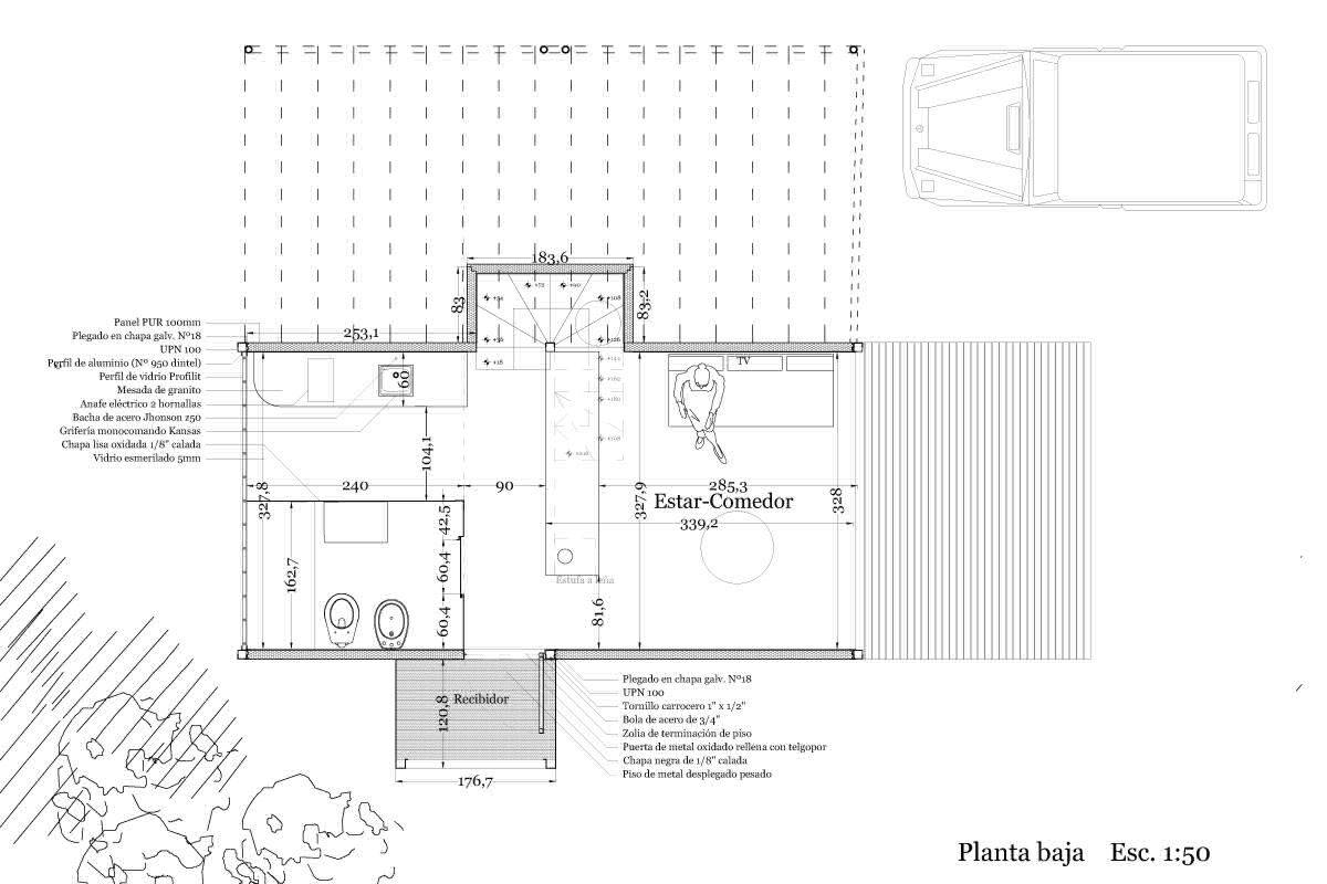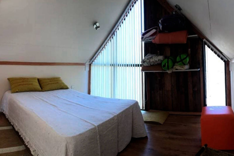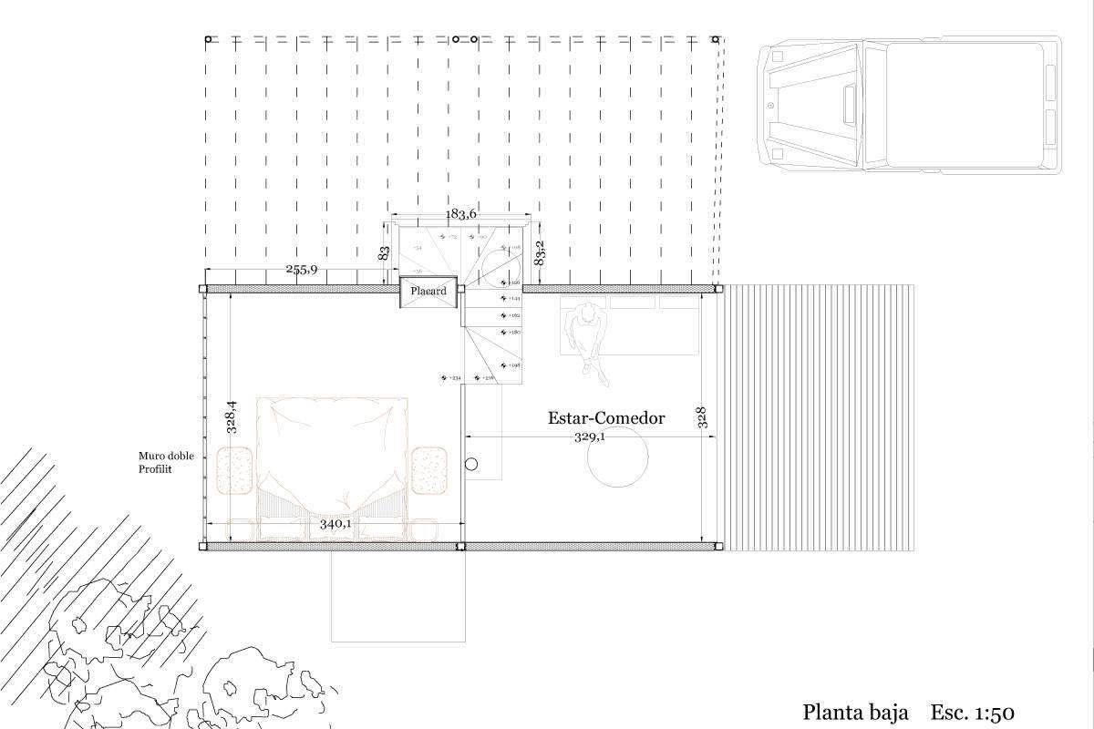 La cabaña se cierra hacia el Oeste de donde vienen los vientos predominantes y genera el hall frío e ingreso de la cabaña a resguardo del mismo en la cara este de la construcción. El Estar comedor se abre hacia el punto cardinal óptimo, con un amplio deck exterior, aprovechando el sol y su vista principal “el Cerro Horqueta”, siendo el mismo el más imponente por su altura y proximidad.